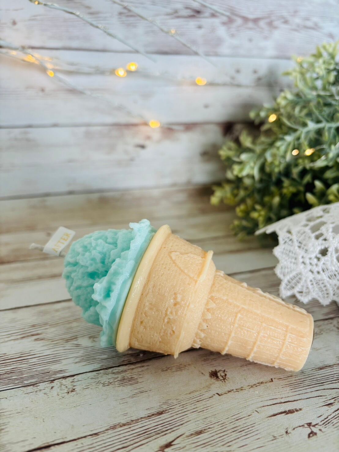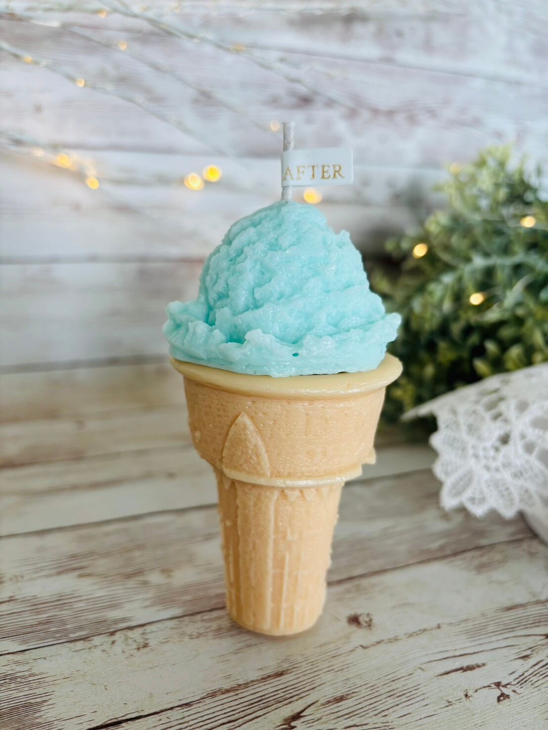 コーンに乗ったカラフルなアイスクリーム形のキャンドルを5種セットにしました。材料はミツロウです。