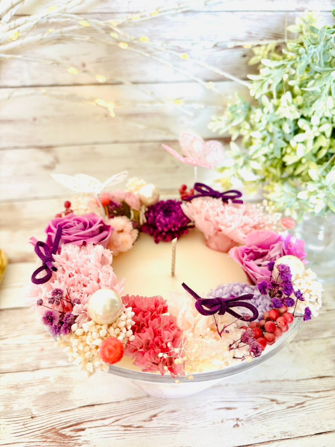 プリザーブドフラワーや一部のドライフラワーは取り寄せたものを使用しておりますので、色番や形などが変動します。同じ種類のキャンドルをお選びになっても一つ一つ色味や形などが違いますことをご了承下さい。