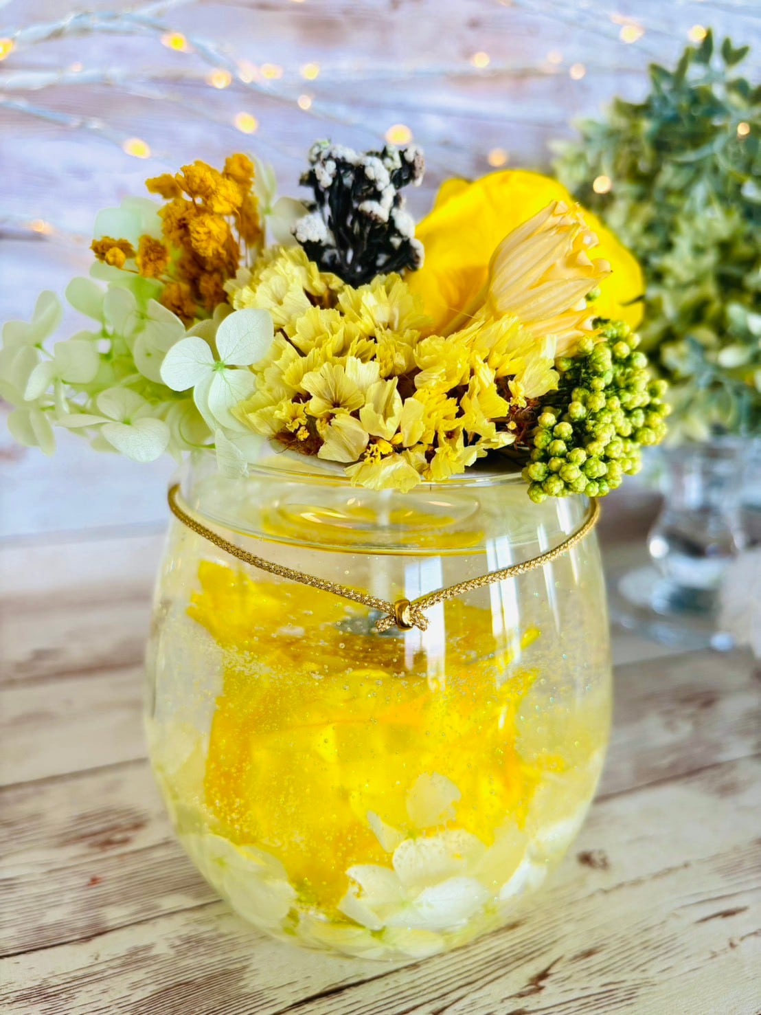 プリザーブドのアジサイと一緒にジェルキャンドルに閉じ込めました。