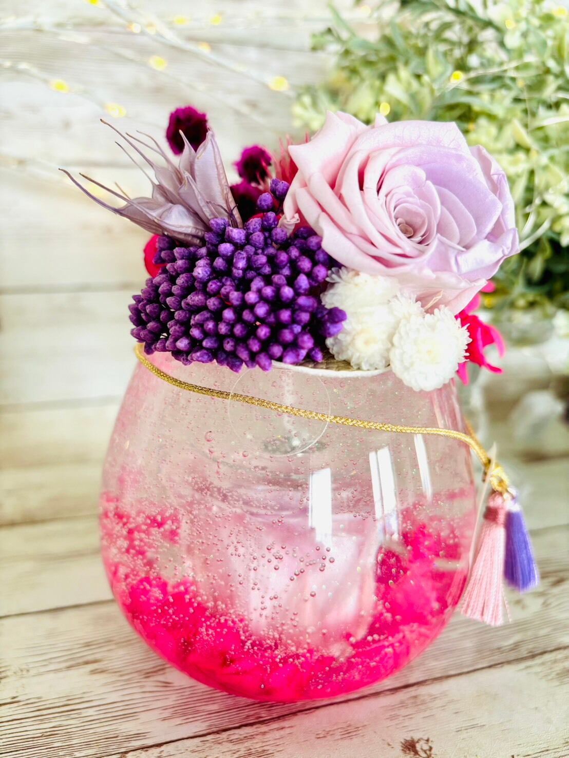プリザーブドフラワーや一部のドライフラワーは取り寄せたものを使用しておりますので、色番や形などが変動します。同じ種類のキャンドルをお選びになっても一つ一つ色味や形などが違いますことをご了承下さい。