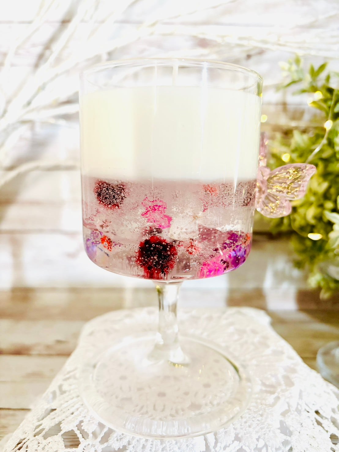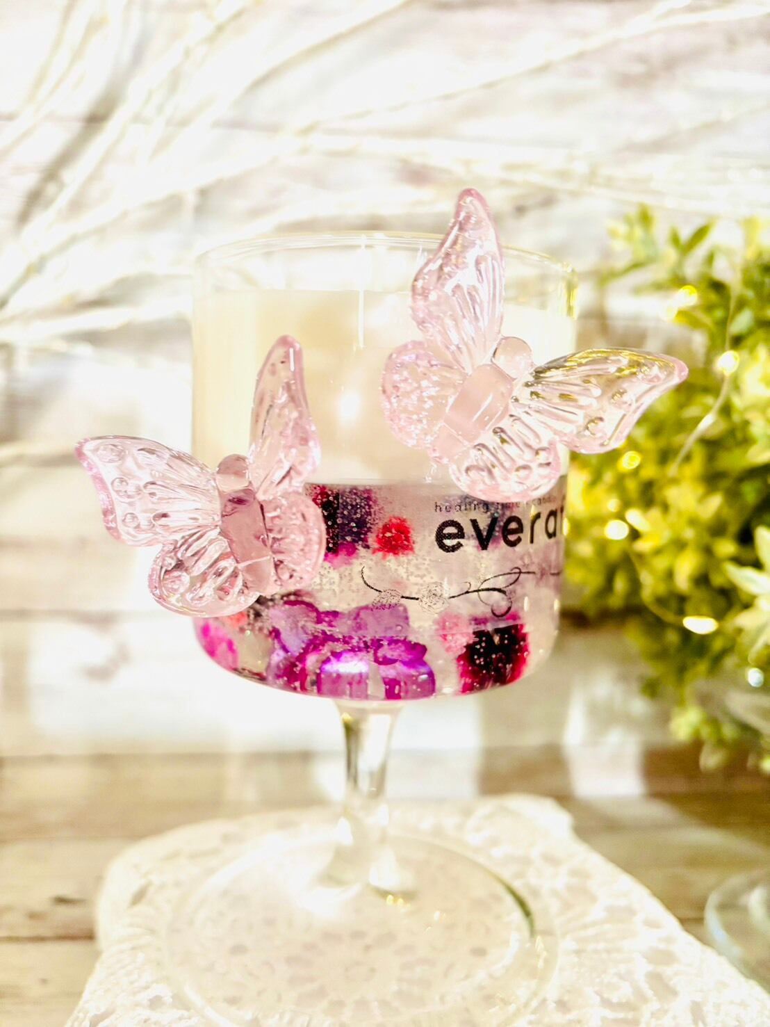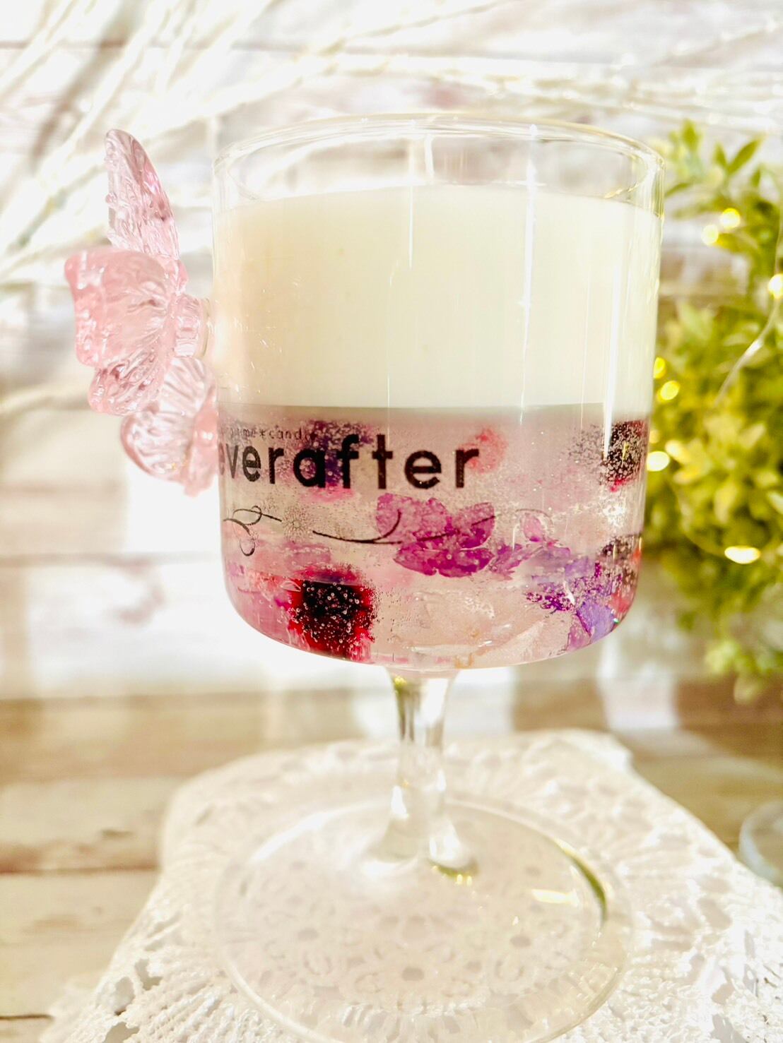 ピンク色の蝶がついた可愛いグラスを見つけたので、小さなお花を入れたジェルとソイのツートンのキャンドルに仕立てました。