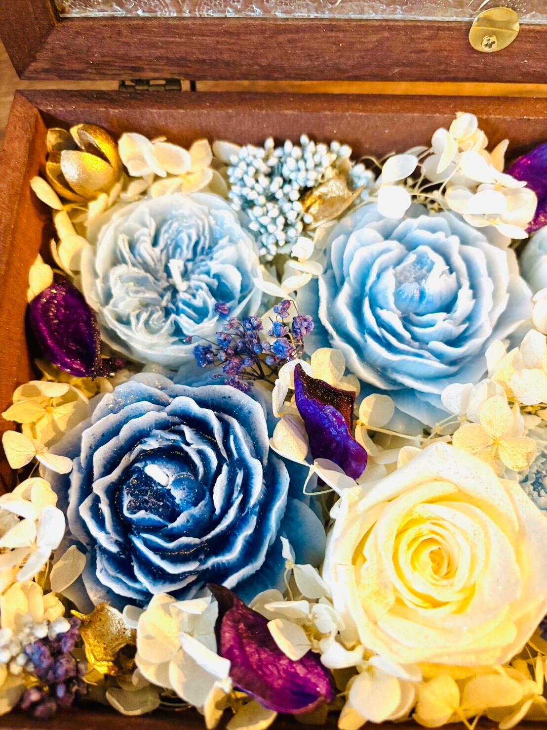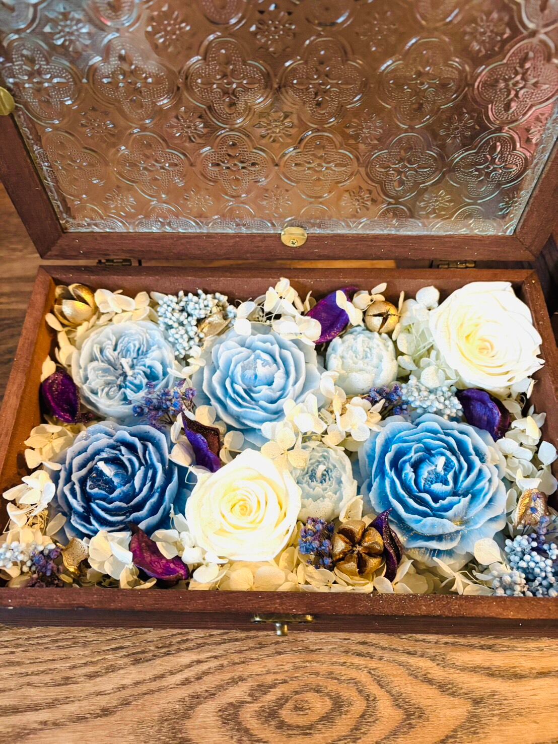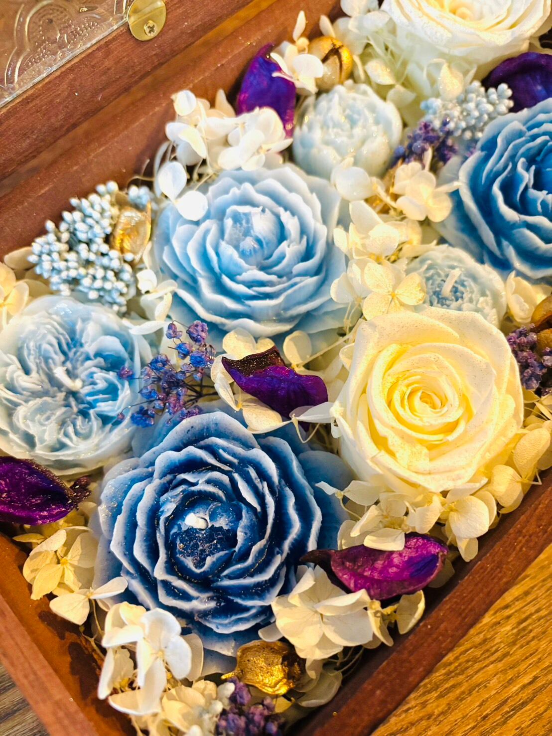 ミツロウで作った3種類の大きさのバラの形のキャンドルを6つと、たくさんのプリザーブドフラワー(バラ、アジサイ、ライスフラワー、かすみ草など)をぎゅっと詰め込んだプレゼントボックスです。