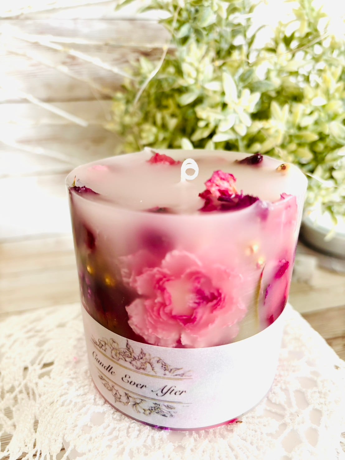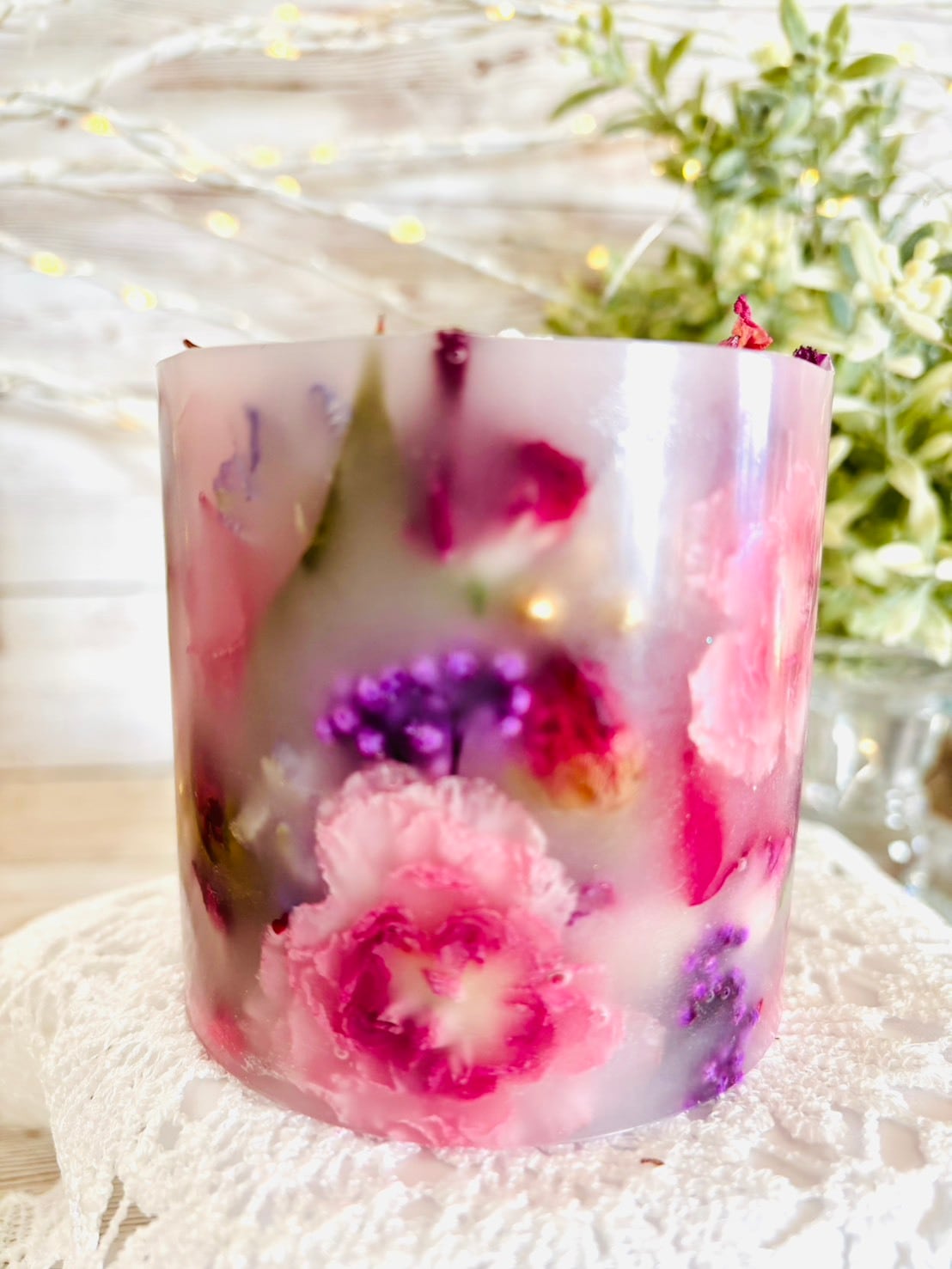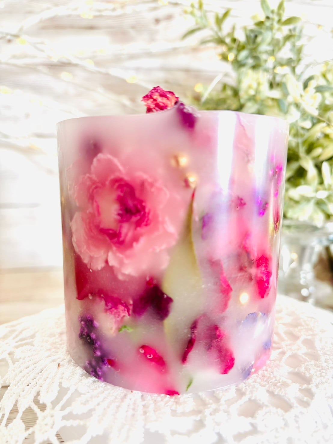 ピンクのラナンキュラスを中心にバラやライスフラワーなどの小さなお花をたくさん詰めてボタニカルキャンドルに仕立てました。