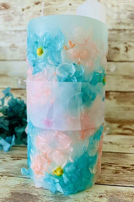 つるっとしたキャンドルを作ったあとアジサイがよく見えるように表面を加工しました。