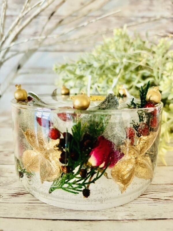 パラフィンとジェルの組み合わせにローズヒップやバラ、松の葉などを使った冬らしいキャンドルにしました。